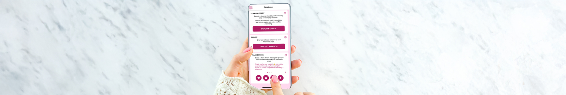 Submit Instantly: Use the Komen app from the Apple or Android store. Log in with the same username and password you used to create your fundraising page. From the Menu, navigate to Donations, and tap the Deposit Check button to submit checks to Susan G. Komen and instantly add to your fundraising total.