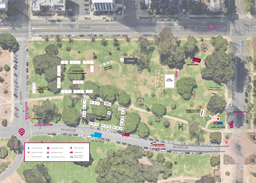 The will be approximately 2.5 miles in length. Please note our route travels along highway SR 163 with a steep incline on the Quince Street exit ramp. A 1.5 mile route through Balboa Park will be available for those who do not wish to walk along the freeway and encounter the incline of the Quince Street exit ramp.