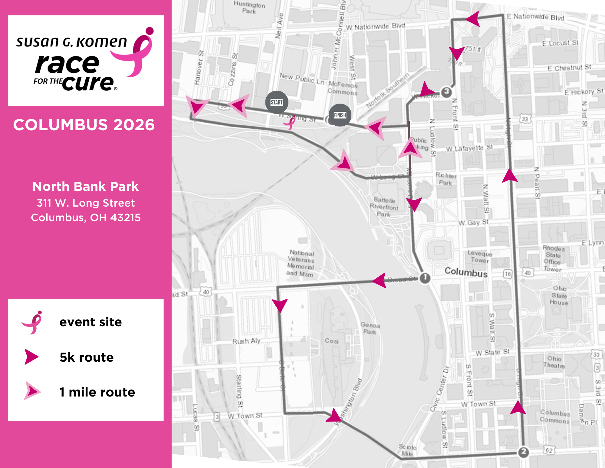 There will be a break between the opening ceremony and the race start time. This time will be for our survivors and those living with metastatic breast cancer to link back up with their loved ones after the Pathway of Hope, restroom breaks and to allow time for all participants to line up at the start line.