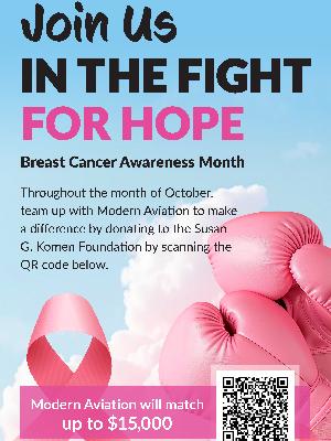 All donations will go to the Susan G. Komen Foundation, and Modern Aviation will proudly match contributions up to $15,000.