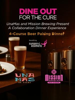 Join Una Mas on Adams and Mission Brewing for an unforgettable evening where exceptional cuisine, craft beer pairings, and meaningful impact come together. This intimate four‑course beer‑pairing dinner brings our community together in support of Susan G. Komen’s mission to end breast cancer.All ages are welcome, and refreshing non‑alcoholic beverages—such as agua fresca—will be provided as well.